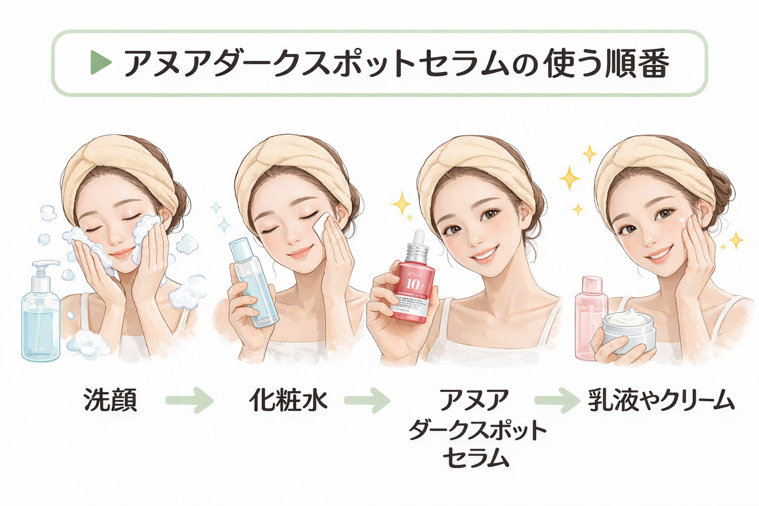 洗顔 → 化粧水 → アヌア ダークスポットセラム → 乳液やクリームの順が基本です。